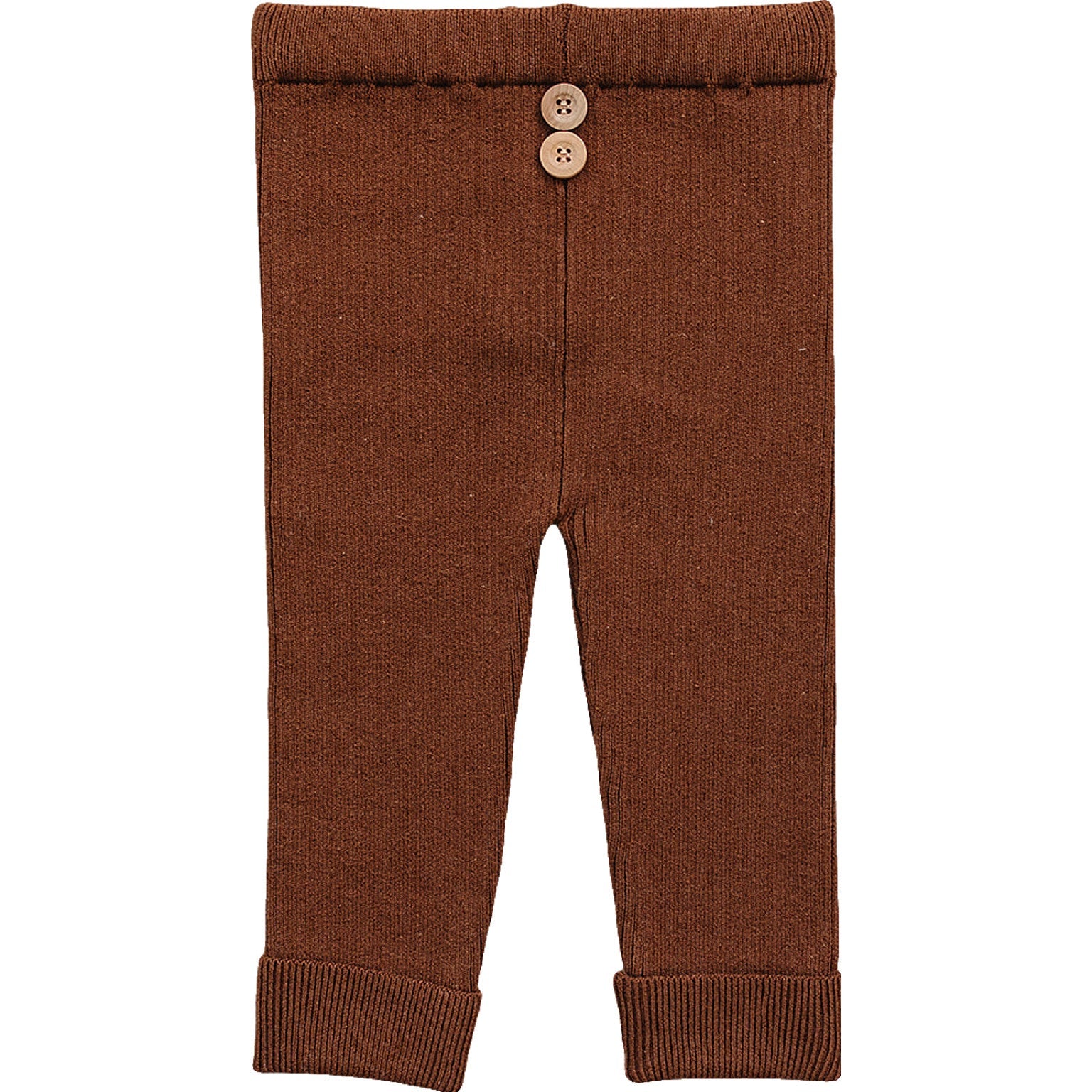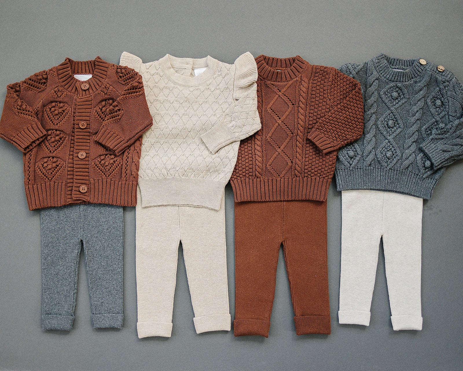These are our knit cotton leggings. They are made out of a cotton fabric with an elastic waist! They are perfect to pair with our sweaters or a cute t-shirt while keeping your little one comfortable. They have faux buttons for a fun detail!