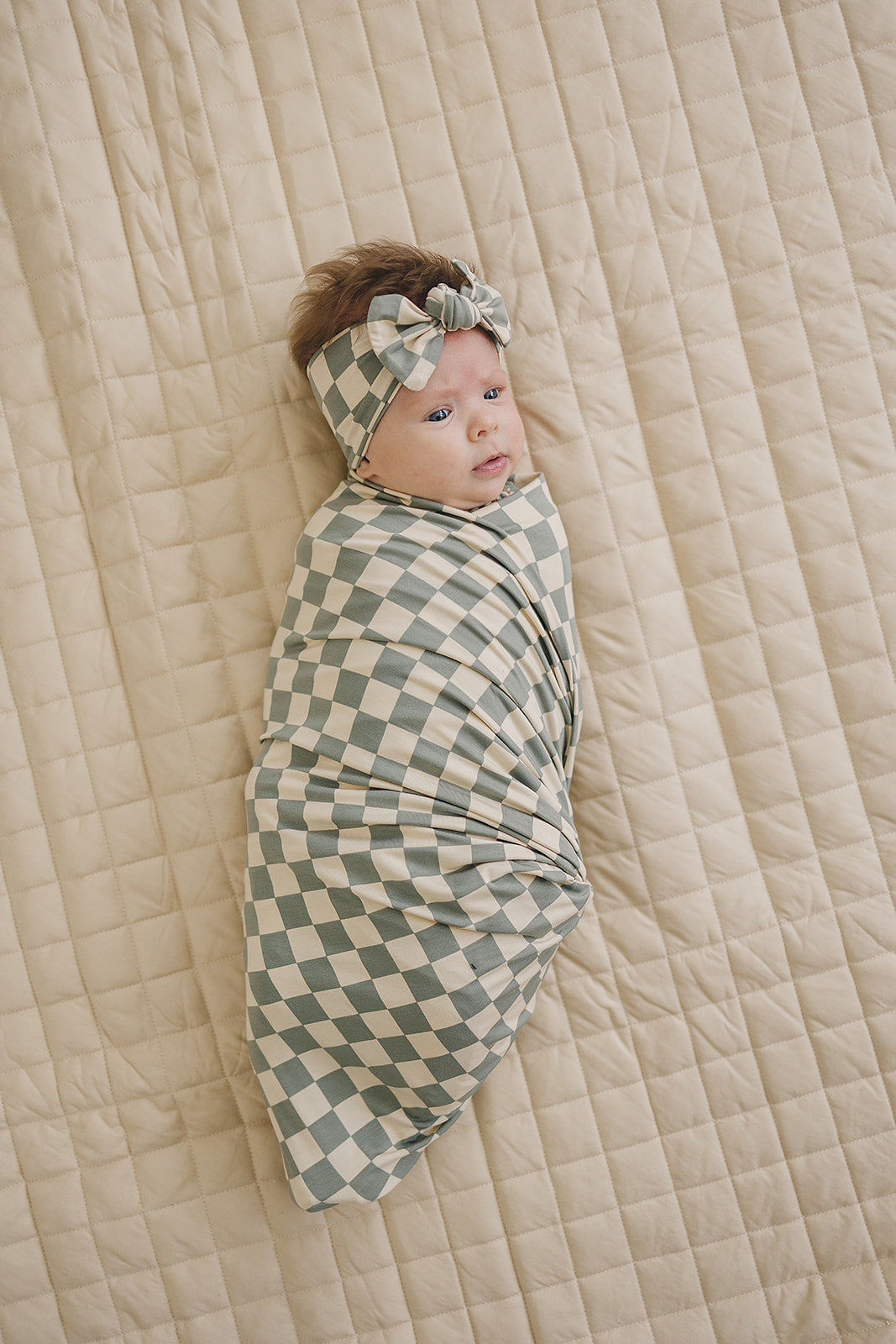 This is a one size head wrap that will fit size newborn and up. It is made out of the same fabric as our bamboo stretch swaddles.