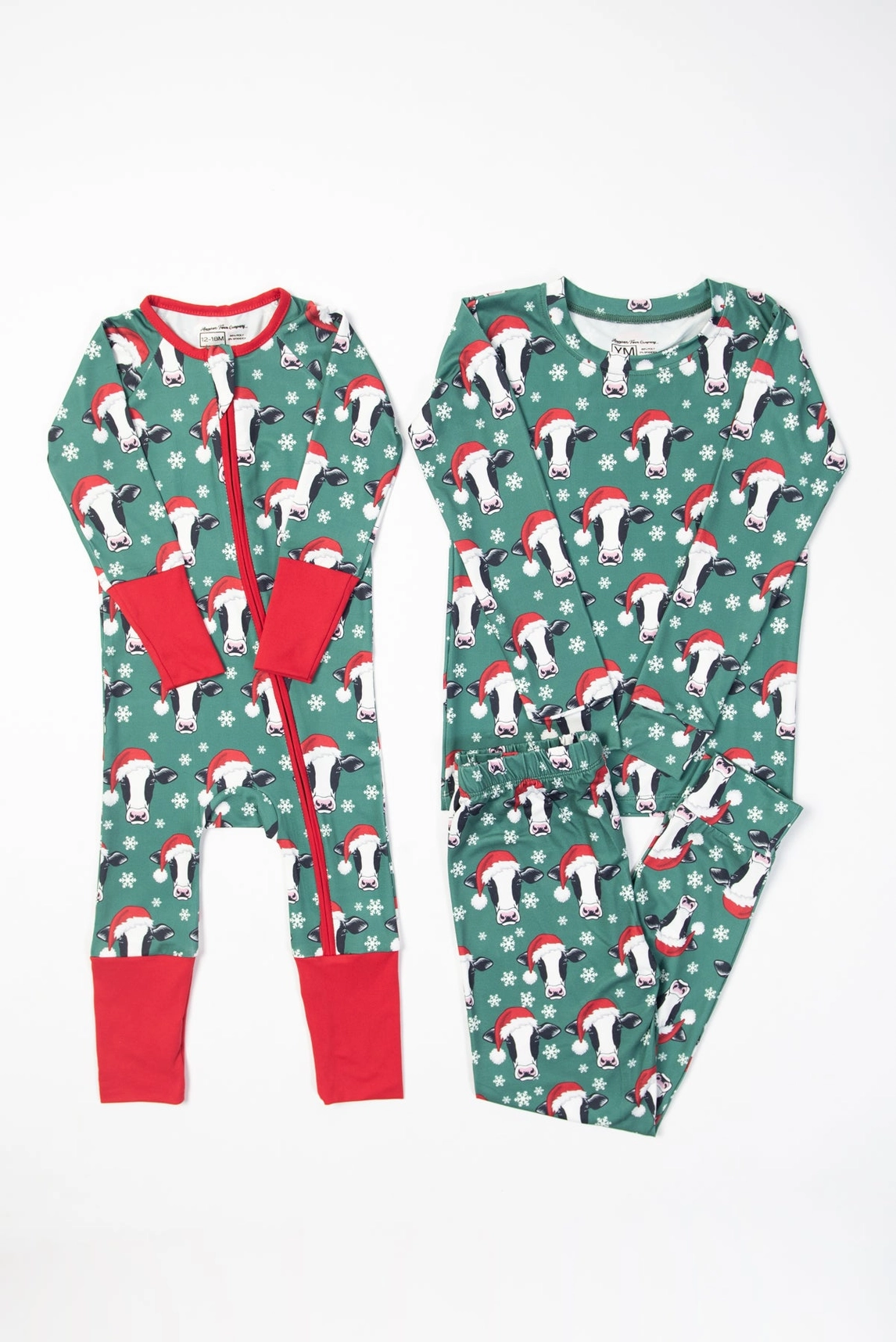 Get your little ones ready for cozy holiday fun with our Santa Cows & Snowflakes Toddler/Youth Pajama Set. Featuring long sleeves and pants crafted from buttery soft, lightweight poly-lycra fabric, these pajamas keep kids comfy all night. The playful Santa cows and snowflakes design adds festive cheer, perfect for matching the whole family in style this Christmas.