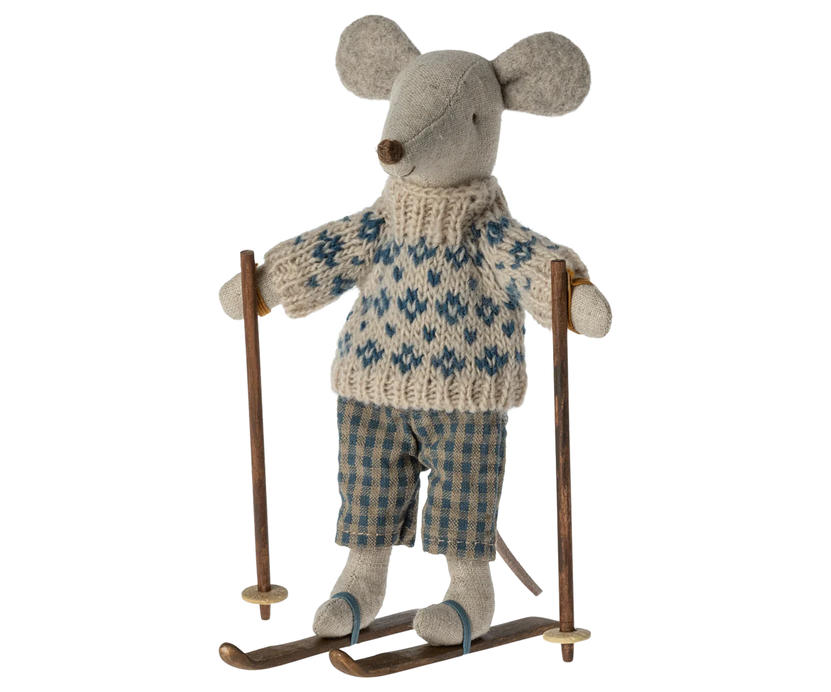 A mouse ready for hours of fun on the slopes during the cold wintertime. Each playset contains a warmly dressed mouse with a pair of ski and poles. A funny detail is the ears which are made so they look like the mouse is wearing ear warmers.